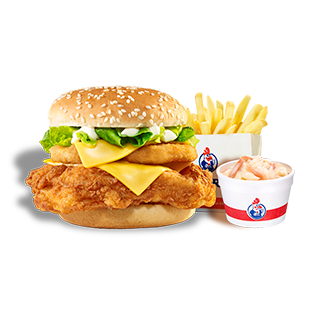 Chicken Breast Fillet Coated & Cooked the Favorite Way. Served with Two Onion Rings, Double Cheese, Lettuce & Cool Mayo in a Sesame Seeded Bun.