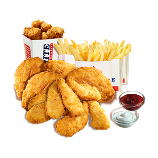 4 pieces Favorite Breast Fillet Chicken, 8 Crispy Fillet strips, large Chicken Poppas & 4 regular Favorite McCain SureCrisp Fries.