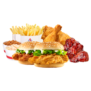 Any Combination of 2 Fillet Burgers or Fillet of Fire Burgers, 4 Pieces Favorite Chicken, 8 Favorite Wings, 2 Large Tub Sides & 4 Regular Fries.