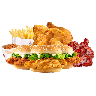 Any Combination of 3 Fillet Burgers or Fillet of Fire Burgers, 6 Pieces Favorite Chicken, 12 Favorite Wings, 2 Large Tub Sides & 4 Regular Fries.