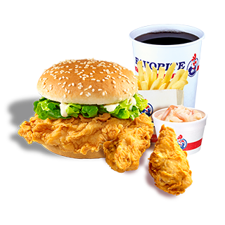 Fillet of Fire Burger Plus 2 Favorite Wings or 1 piece of Traditional Favorite Chicken.